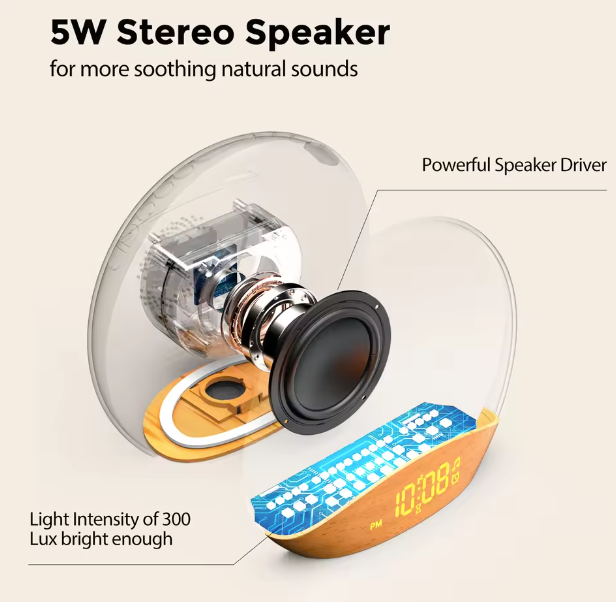 Wake up gently and drift off peacefully with this calming all-in-one sunrise alarm clock. Designed in a warm wood finish, it mimics a natural sunrise to slowly brighten your room, helping your body wake up feeling rested instead of jolted by harsh alarms. At night, soothing white noise and soft ambient light create a cozy atmosphere that supports deep, uninterrupted sleep.